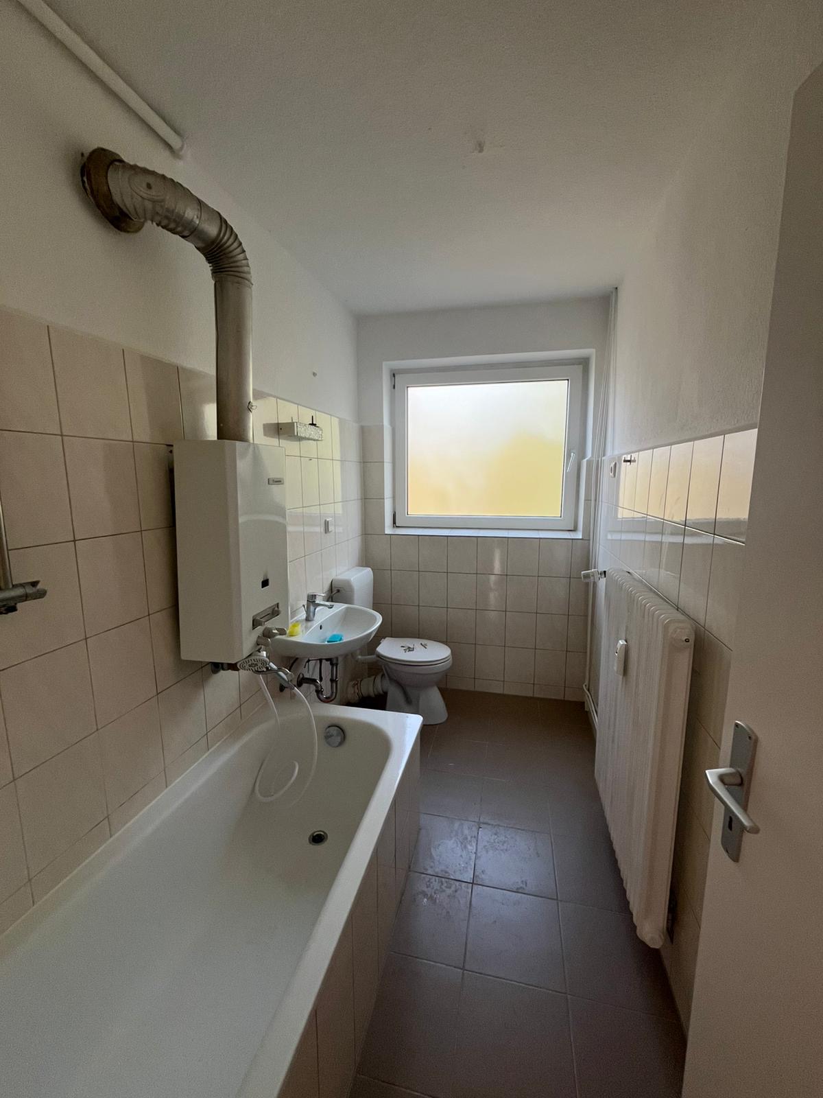 Das Badezimmer ist funktional ausgestattet und verfügt über eine Badewanne, ein Waschbecken sowie ein WC. Auch hier sorgt ein Fenster für natürliche Belüftung und zusätzliches Licht.