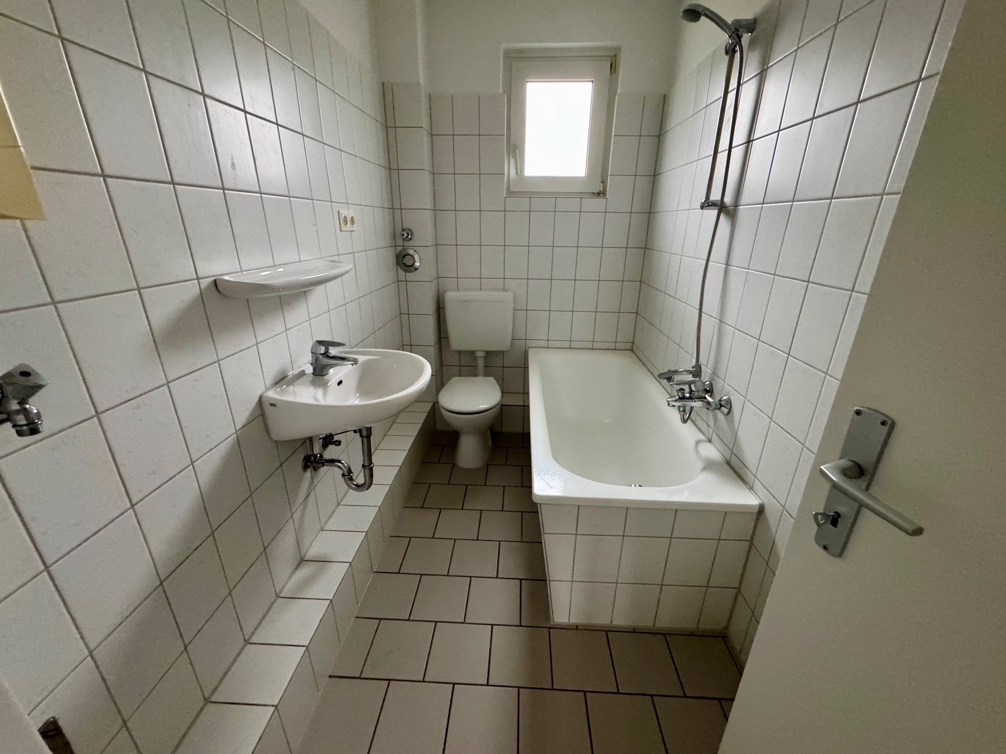 Das Badezimmer ist mit einer Badewanne sowie einem Waschmaschinenanschluss ausgestattet und verbindet Funktionalität mit Komfort.