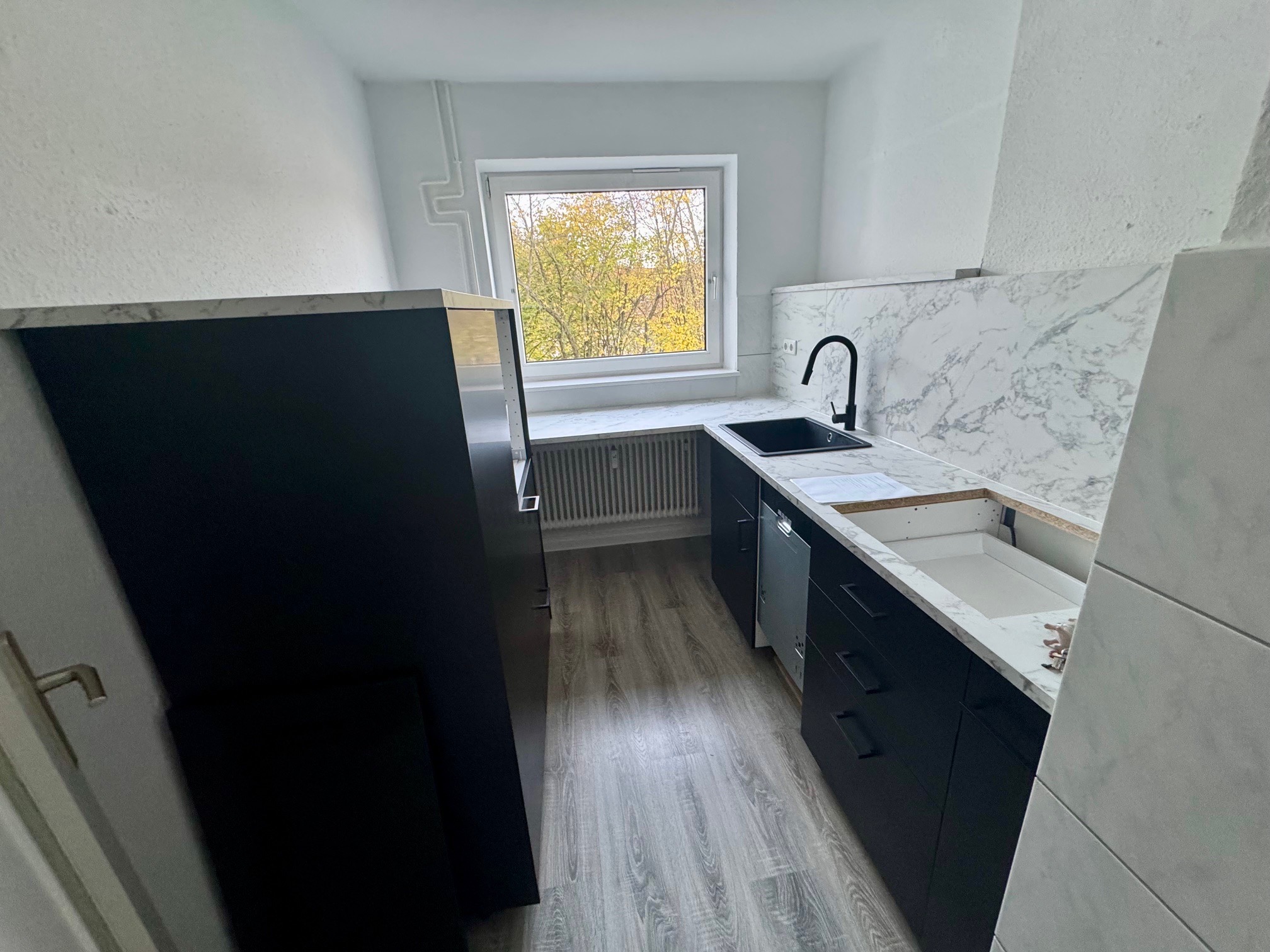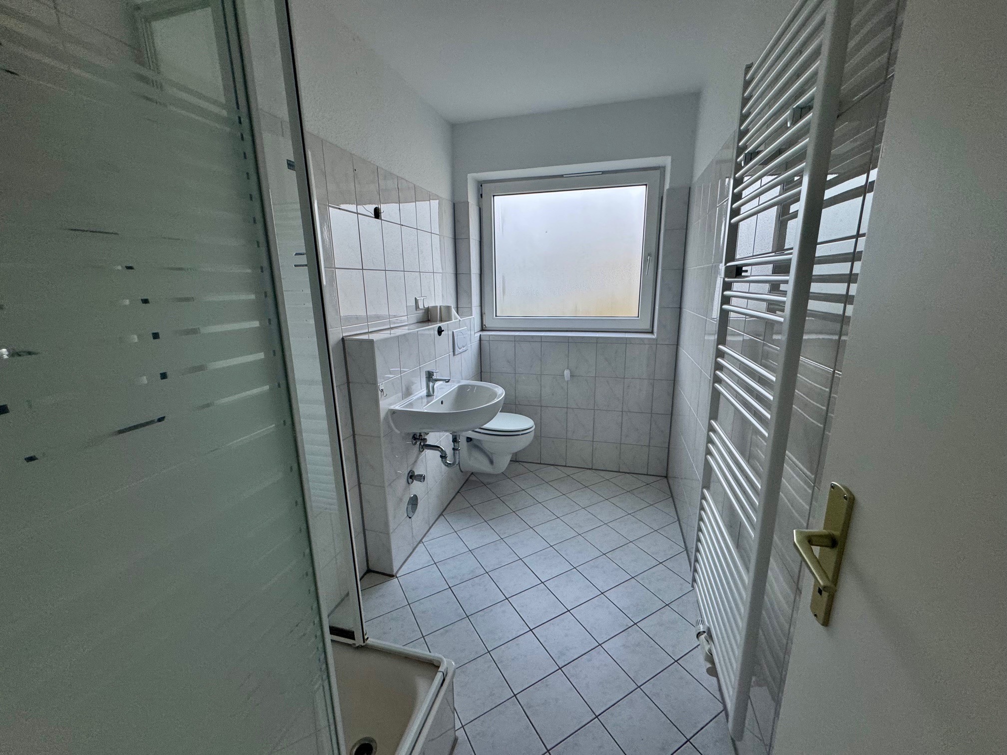 Die Küche ist mit einer gepflegten Einbauküche ausgestattet (ohne Herd und Kühlschrank); diese geht mit Anmietung in den Besitz des Mieters über. Das modern gestaltete Badezimmer verfügt über eine Dusche, ein wandhängendes WC, einen Handtuchheizkörper sowie einen Anschluss für die Waschmaschine.